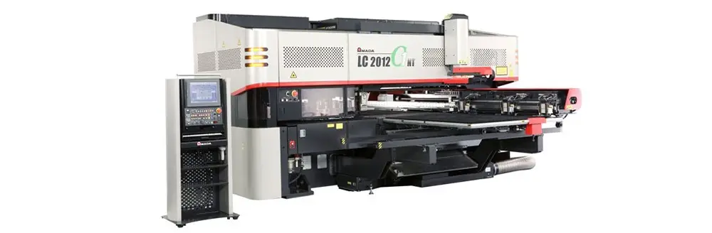 The Amada LC 2012 C1 NT combines punching and laser cutting capabilities in a single machine, enhancing versatility and productivity. Featuring a 1.2KW Co2 laser and a 46-station turret with tapping units, it efficiently processes complex parts. The integrated automatic sheet loader and brush table system minimise manual handling and protect material surfaces during processing