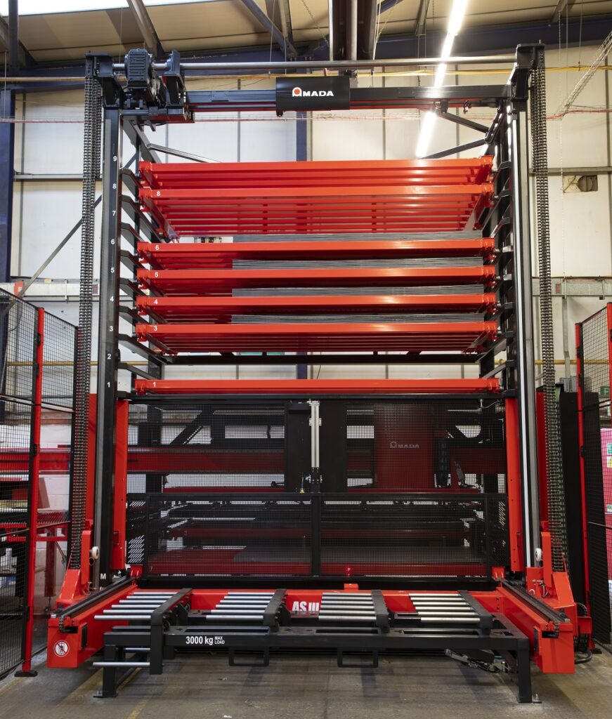 The Amada AS III MP 300 stores up to 27 tonnes of sheet metal, with nine shelves each storing three tonnes. It will automatically feed the turret punch and change both the sheet and pallet shelf without human intervention.